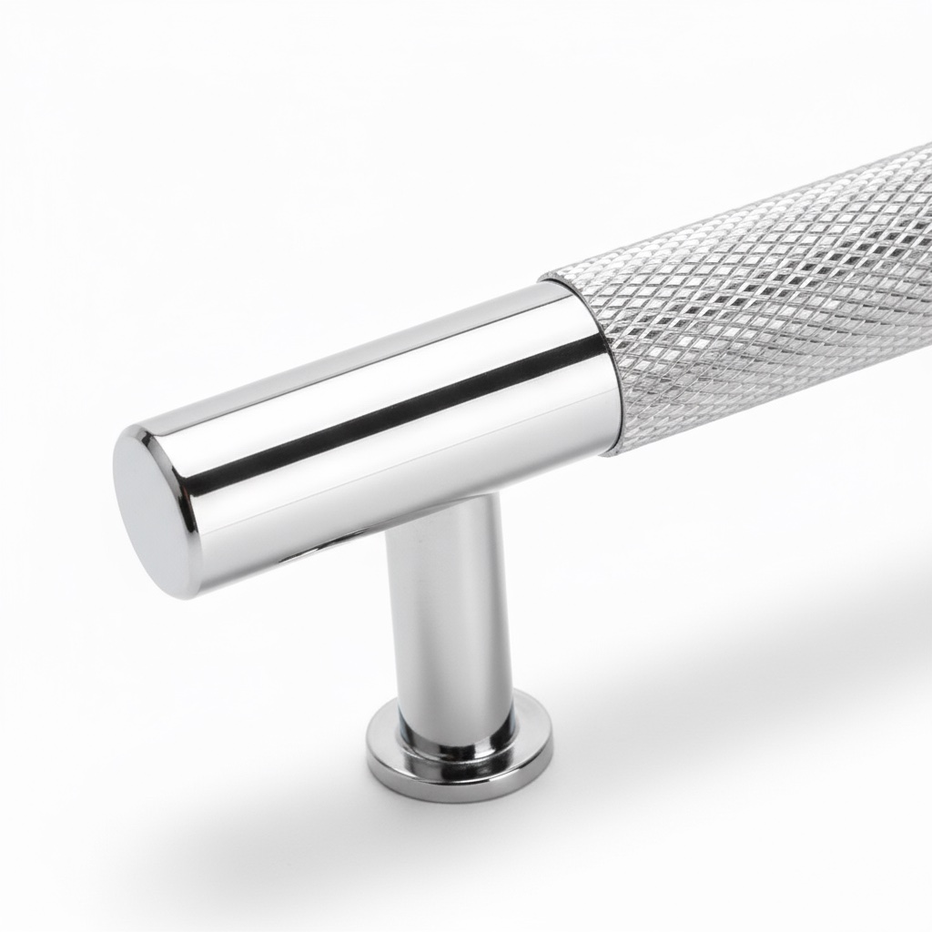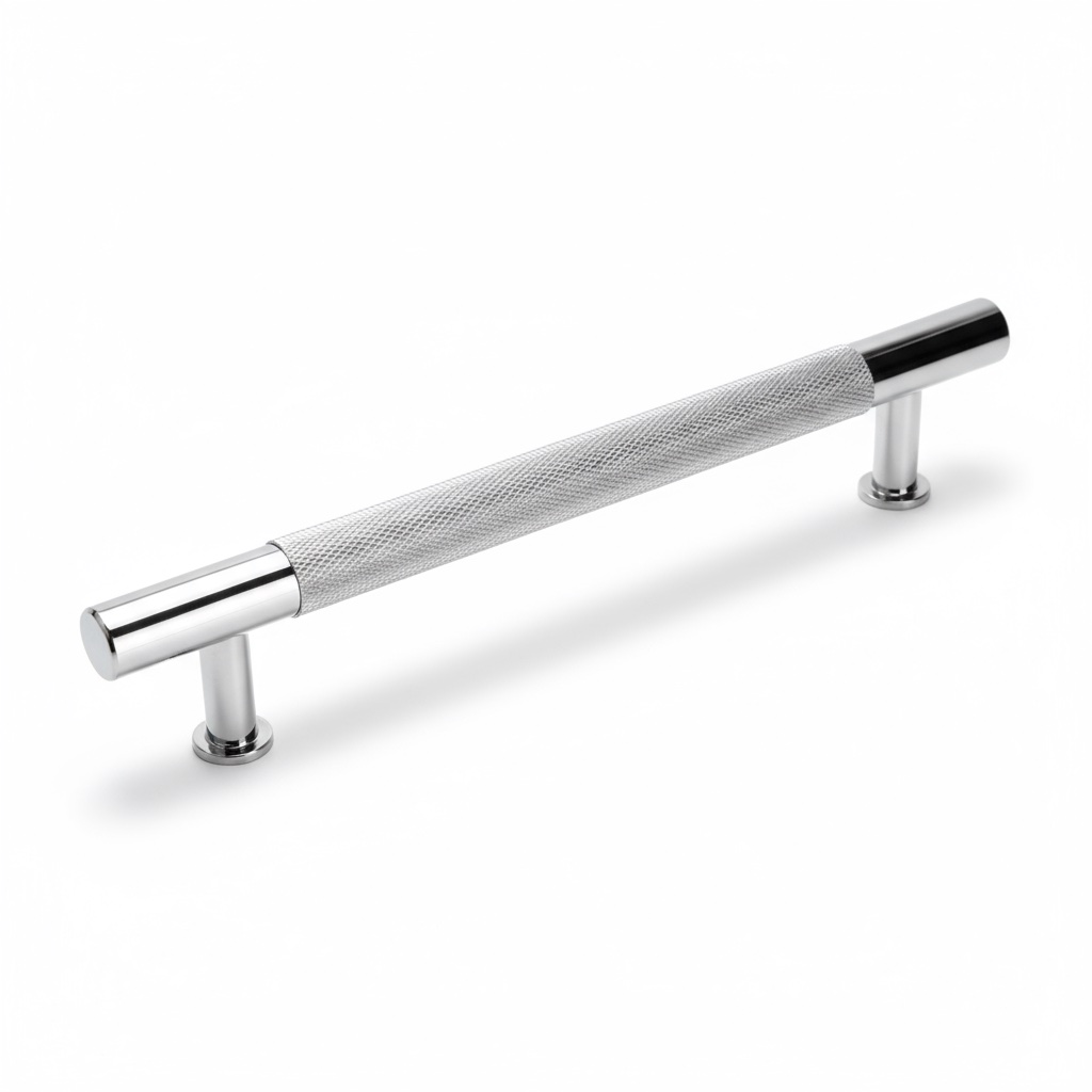 Exklusivt räfflat handtag i silver med sofistikerad design som förenar komfort och lyx.